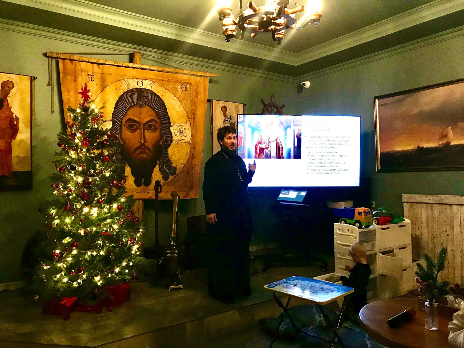 Отец Игорь познакомил гостей с историей Дня святителя Николая. Праздник установлен в память преставления святителя Николая, архиепископа Мир Ликийских, одного из самых почитаемых христианских святых в Русской православной церкви. В разных странах святой Николай стал прообразом новогодних фольклорных персонажей, в частности Санта-Клауса и Деда Мороза. Он прославился как чудотворец: ещё при жизни творил чудеса спасения на море, защиты невинно осуждённых, помощи бедным. Именно поэтому святой Николай Чудотворец считается покровителем путешественников.