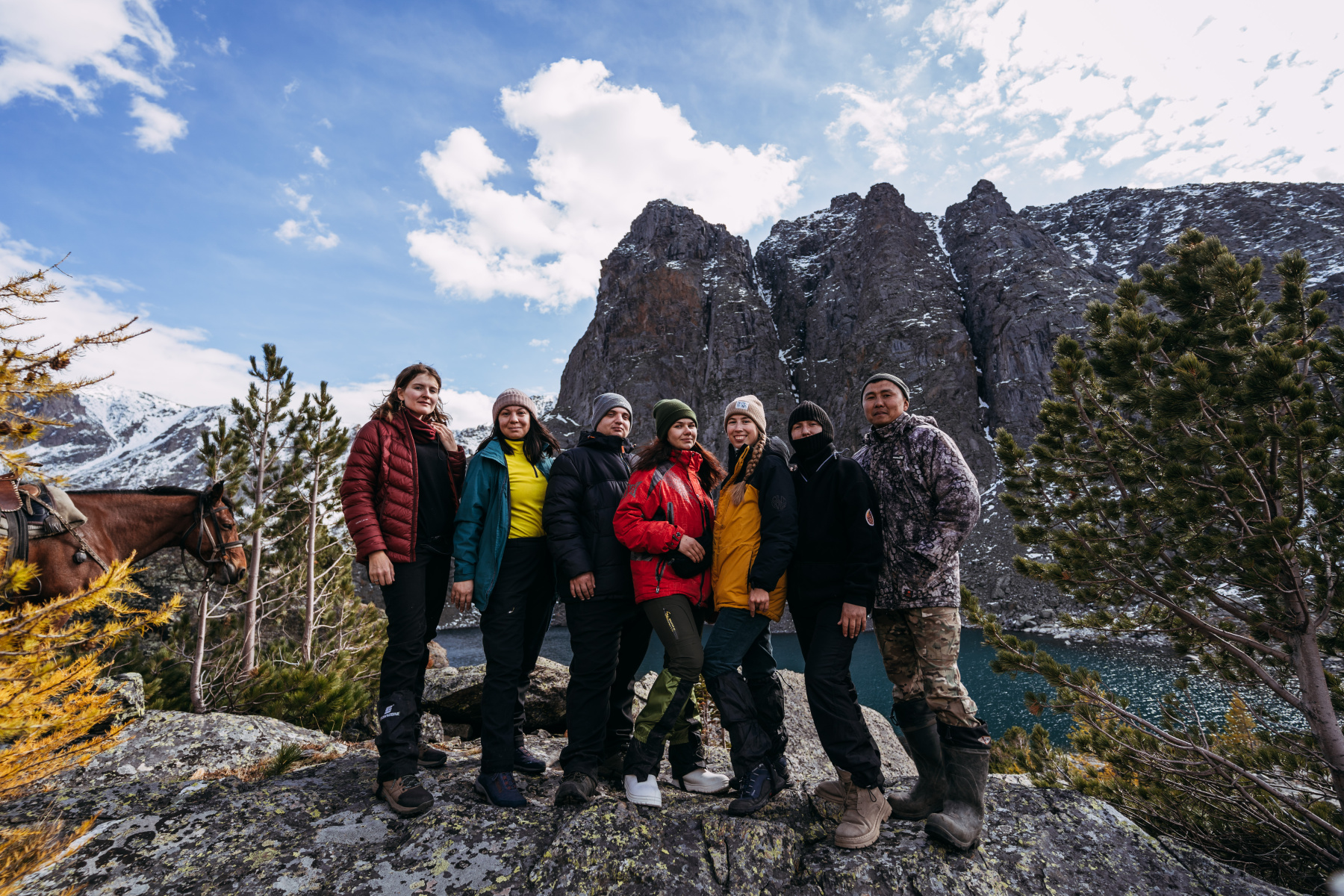 Верхом на конях для изучения природно-ландшафтного разнообразия и установки фотоловушки добровольцы направились к Барбокским озерам. В рельефе территории отчетливо выражены формы древнего оледенения – карлинги, кары, трогообразные долины, моренные холмы, гряды и пр. В морфологии рельефа повсеместно проявлены последствия оползней, селей, лавин, продукты физического выветривания, указывающие на большую активность современных рельефообразующих процессов. Поэтому пейзажи на маршруте сражали живописностью, к которой примешивались осенние краски. Маршрут был средним по проходимости.
