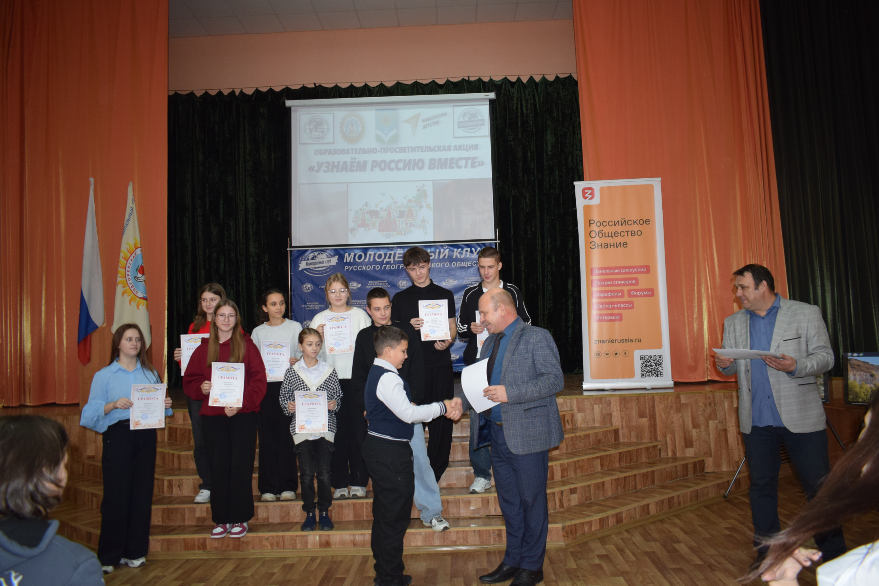 В завершение были подведены итоги работы всех образовательных площадок, после чего прошло торжественное награждение победителей интеллектуальных состязаний и активных участников, которые были отмечены грамотами от Подгоренского лицея имени Н.А. Белозорова и Россошанского местного отделения РГО.