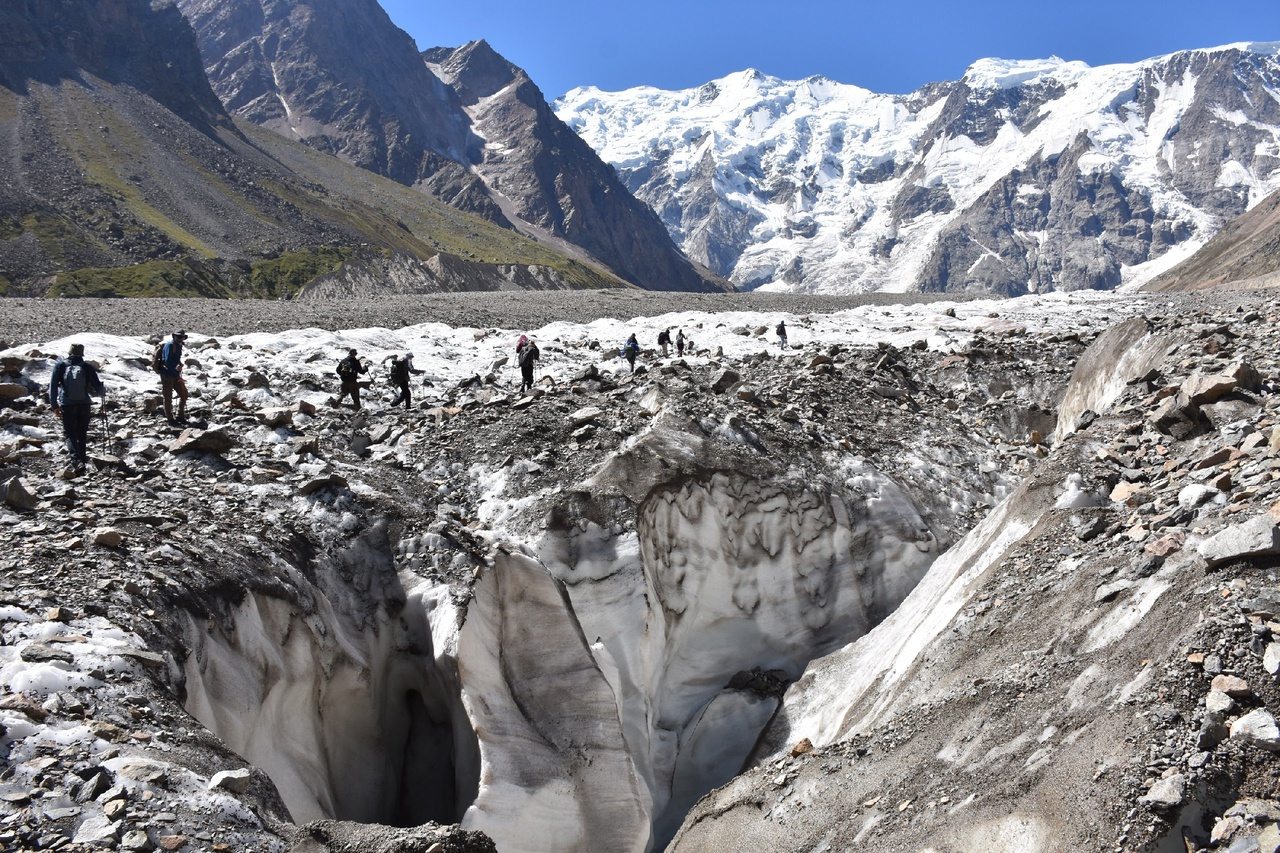 Участники проекта совершили акклиматизационный подход к Безенгийскому леднику, поднялись на высоту 2800 метров над уровнем моря к панорамной точке "Ночевки под шлемом", откуда открывается фантастическая панорама на Северный массив Безенгийского района Главного Кавказского хребта.