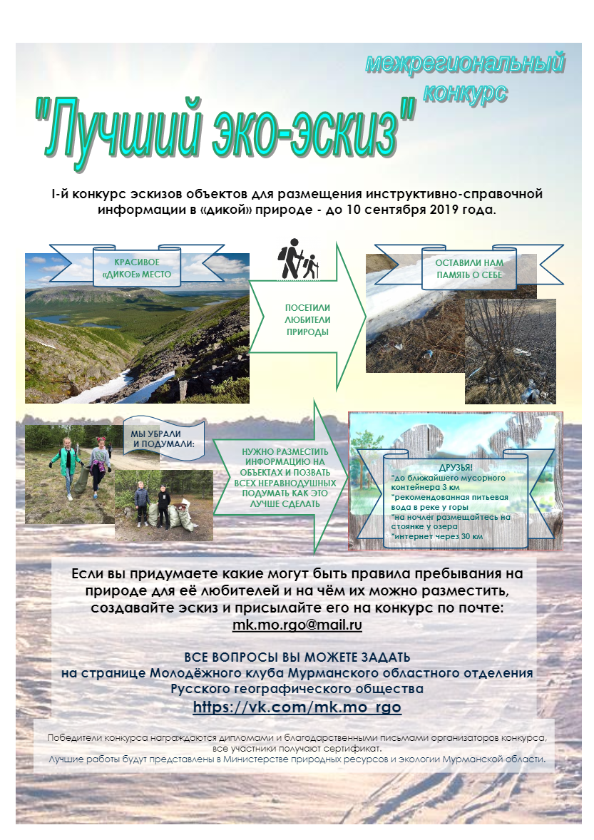 Напомним, что в начале июня также стартовал конкурс Молодёжного клуба РГО на базе Мурманского областного отделения «Лучший эко-эскиз». Участниками могут стать все желающие — необходимо лишь придумать краткие инструкции или объявления, которые помогли бы приезжающим в туристический район у села Ловозеро организовать свой отдых без ущерба местной природе.