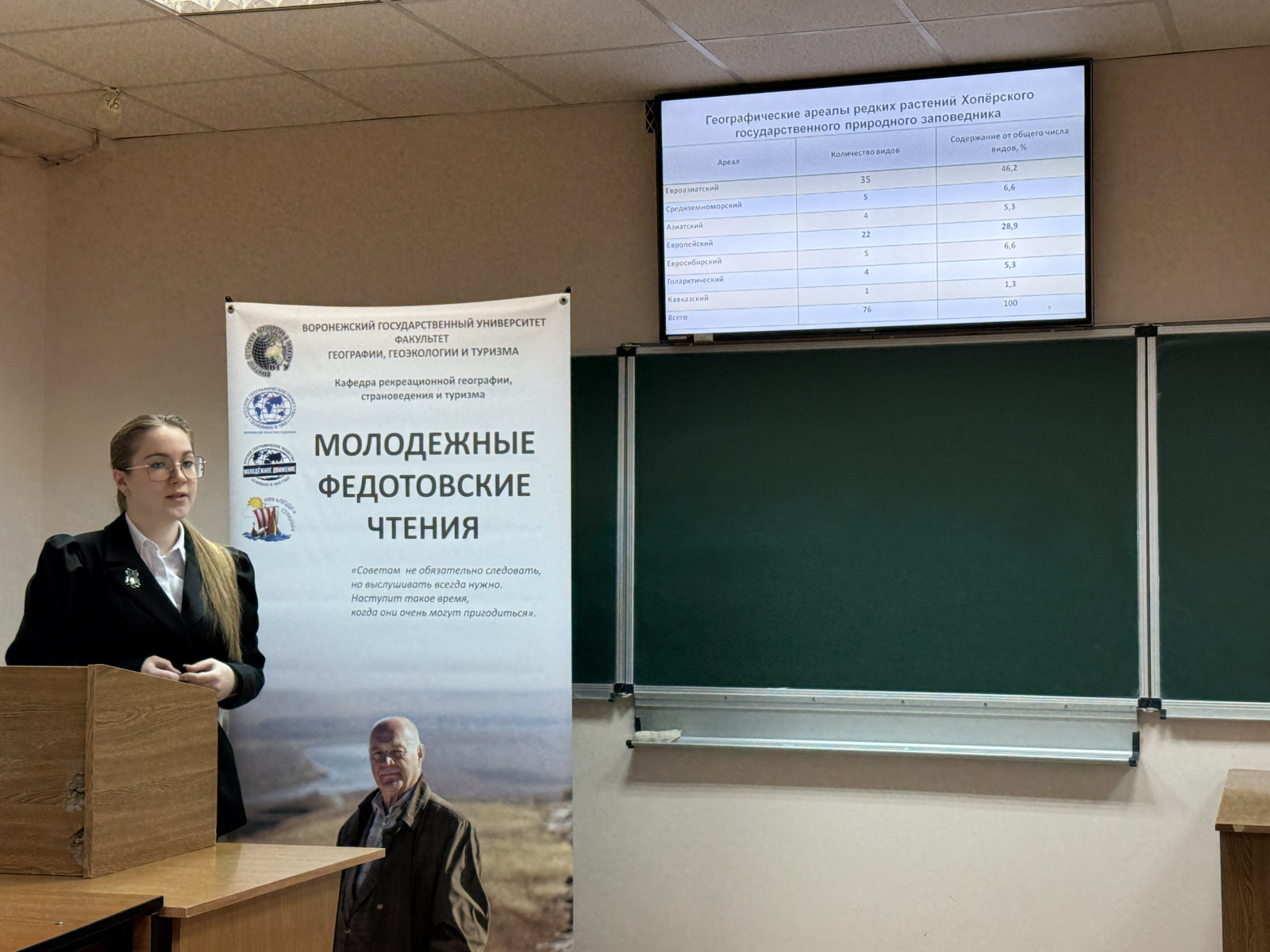 В рамках чтений были представлены доклады, охватывающие широкий спектр научных направлений — от биогеографии и охраны природы до туризма и прикладных географических исследований. Студенты рассказали о результатах исследований в Хопёрском государственном природном заповеднике, проанализировали состояние агроландшафтов Воронежской области, представили ландшафтную карту долины реки Икорец, а также поделились опытом участия в проекте «Заповедное дело РГО» в Астраханском заповеднике.