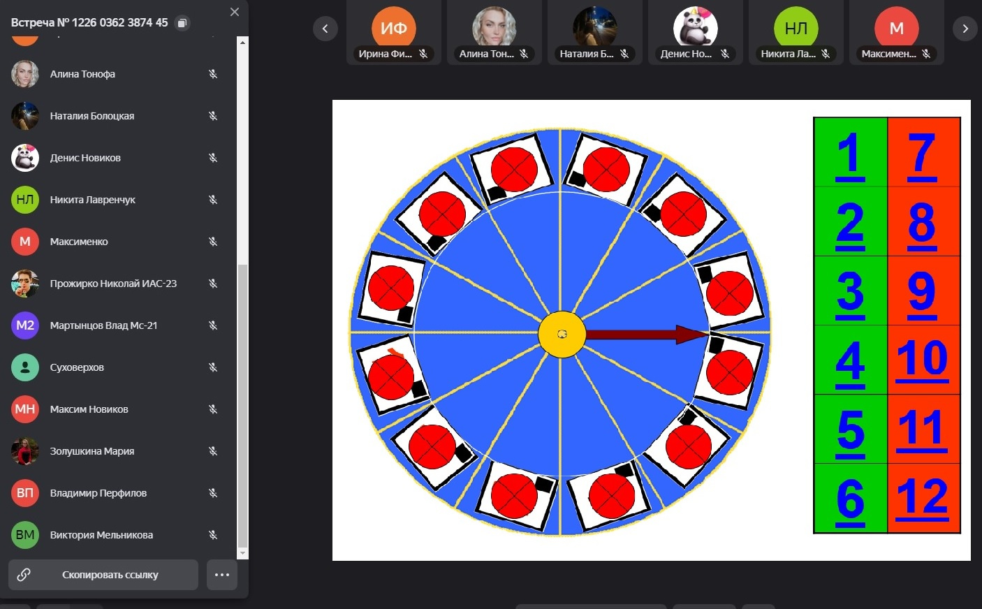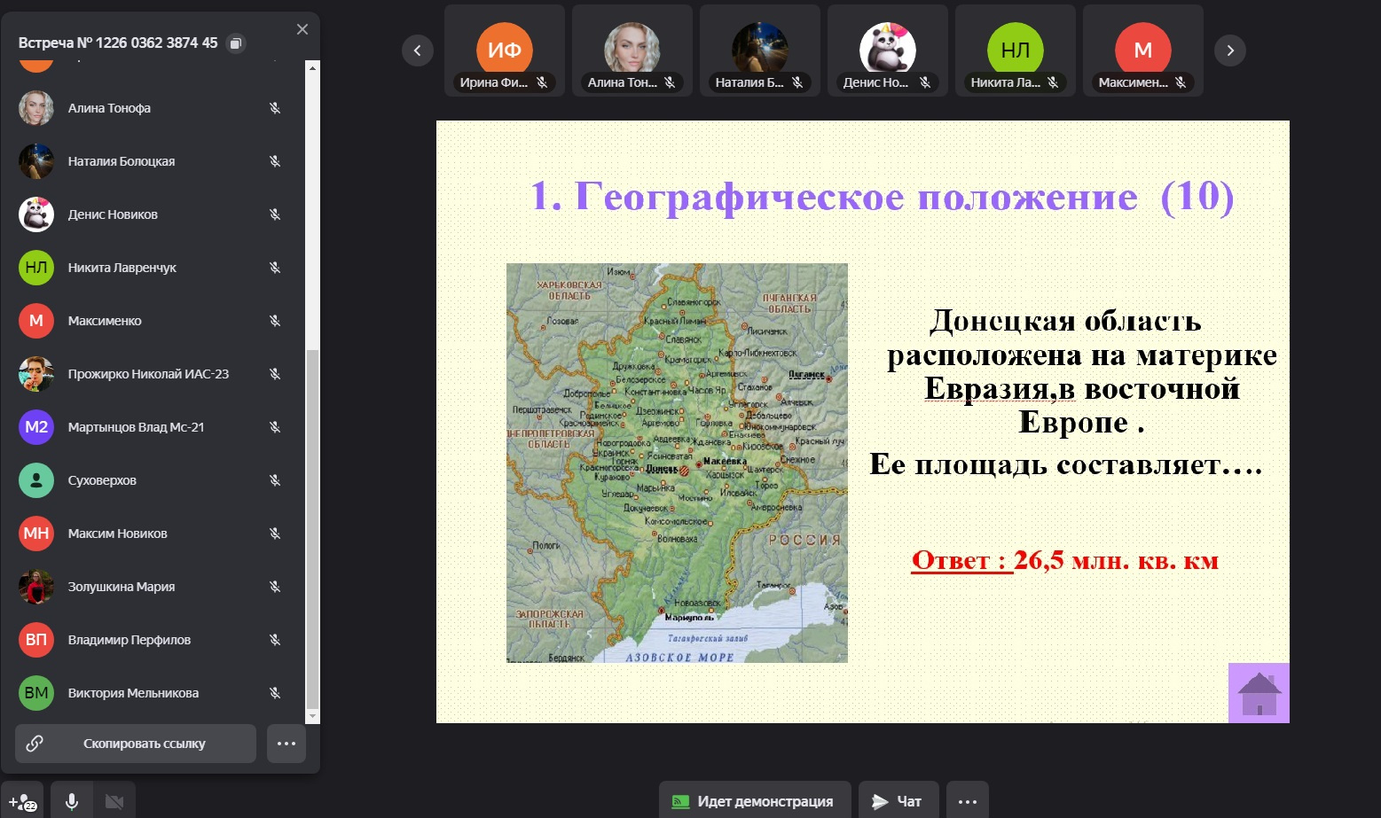 В викторине приняли участие активисты молодежного клуба РГО «Донбасс» - студенты группы ИАС-23, факультета информационных систем и технологий и студенты групп Мс-19, Мс-20, Мс-21, Мс-22 кафедры маркшейдерского дела им. Д.Н. Оглоблина, факультета недропользования и наук о Земле. Несмотря на то, что интеллектуально-познавательная викторина прошла в дистанционном формате, за экранами монитора царила напряженная, но в то же время доброжелательная обстановка. Все участники игры работали дружно и слаженно, внимательно слушали вопросы, рассуждали, пытались логически подойти к решению заданий, поддерживали друг друга, выслушивали точку зрения каждого члена команды. Особый интерес у игроков вызвал сектор «Черный ящик». Но и с этим заданием участники справилась блестяще. Интеллектуальная борьба принесла ребятам массу положительных эмоций. Участники игры смогли показать высокий уровень знаний о Родном крае и расширить свой кругозор.
