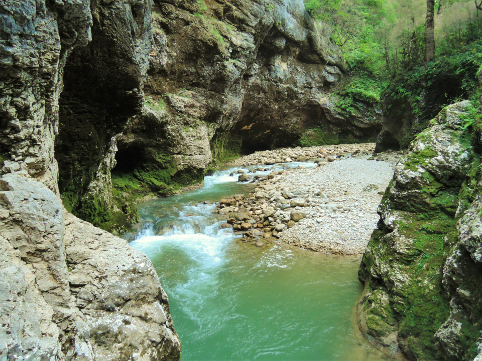 Путь начался в поселке Гуамка. Извилистое Гуамское ущелье направило участников экспедиции вдоль быстроводной реки Курджипс. Бурный поток бирюзовой воды под нависающими скалами-исполинами зачаровывал путешественников. В какой-то момент на пути стали попадаться деревца, полностью покрытые паутиной, будто обернутые в кокон – оказалось, это уникальные самшитовые деревья. Настолько неузнаваемыми стали эти древние растения.