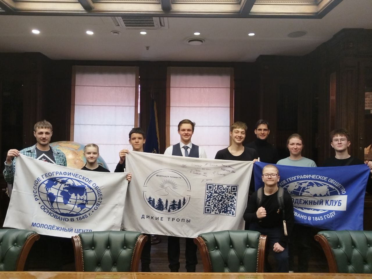 Из 45 учеников Молодёжного клуба "Дикие тропы" была отобрана делегация из шести человек. Ребята и девчата посетили исторические помещения штаб-квартиры РГО в Москве, стали участниками экскурсии и получили наставления от руководства молодёжного крыла РГО.
