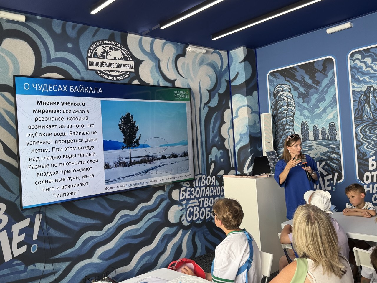 В мир загадочных явлений, присущих озеру, участники погрузились на лекции “Байкал: там, где природа творит чудеса”, которую прочла руководитель Молодежного клуба РГО "Портулан" Наталия Хамина. Речь шла о байкальских миражах – оптических иллюзиях, вызываемых особенностью атмосферных условий над поверхностью озера. Подробно были рассмотрены таинственные кольца на льду Байкала, их происхождение и связь с природными процессами. Поговорили о поющих песках и загадочных воронках, наблюдаемых в районе самой глубоководной части озера.