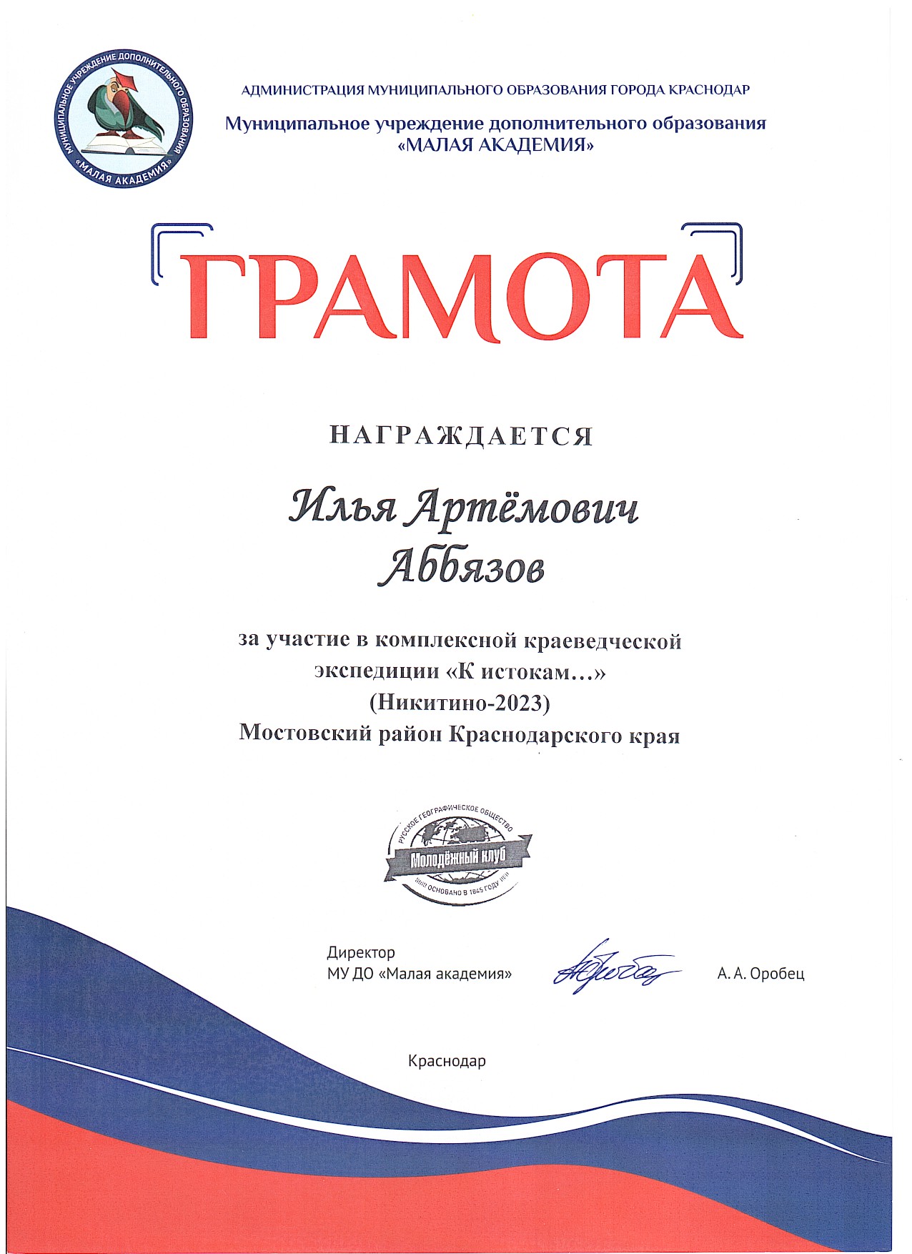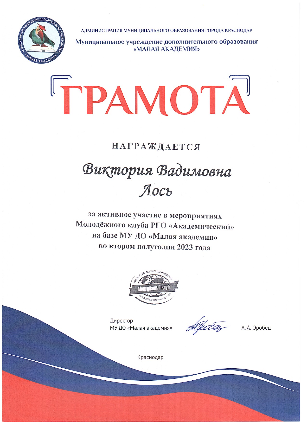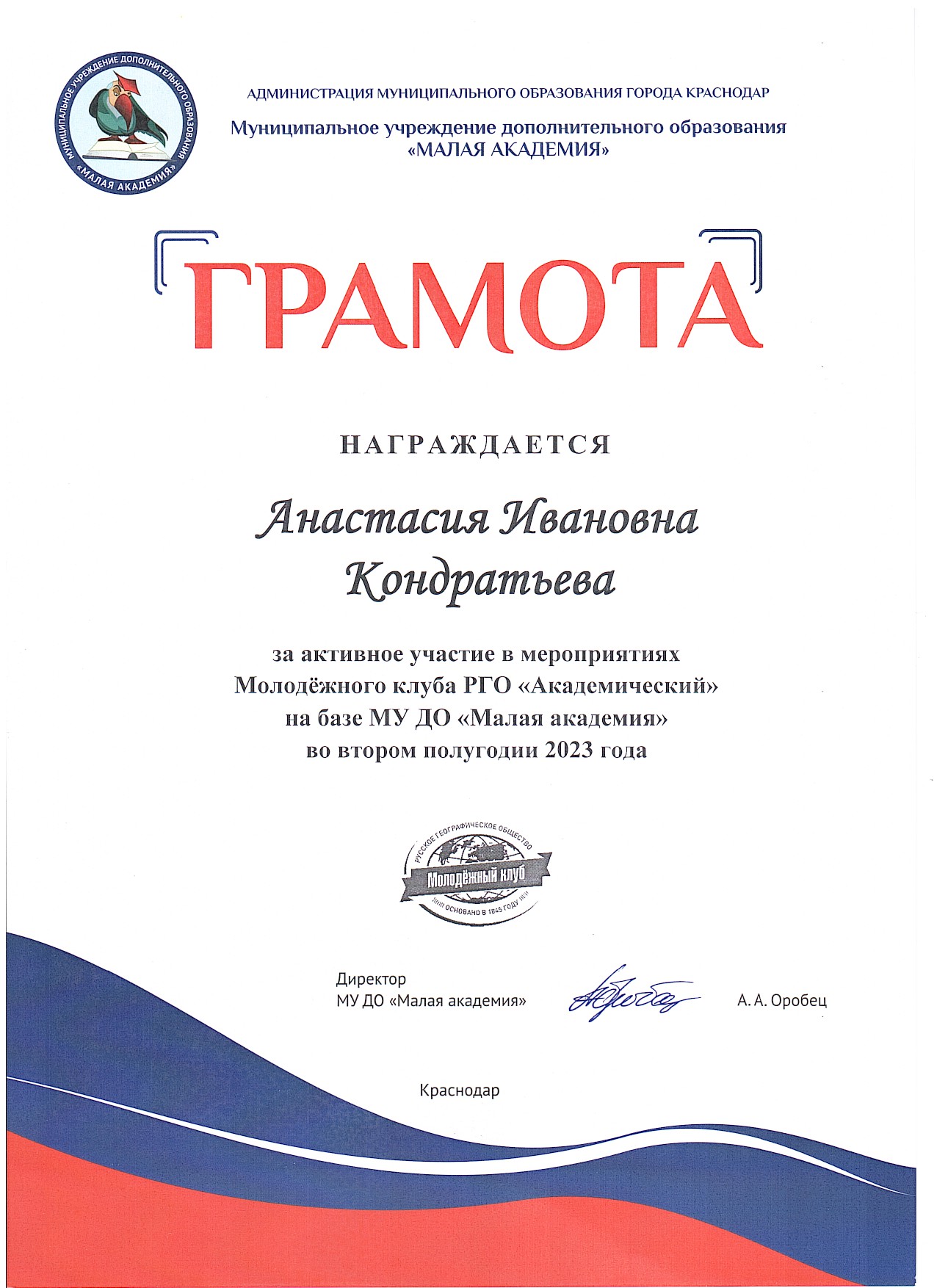 В завершении мероприятия активистам Молодёжного клуба РГО «Академический» были вручены грамоты, после чего, в дружеской обстановке, состоялось чаепитие.