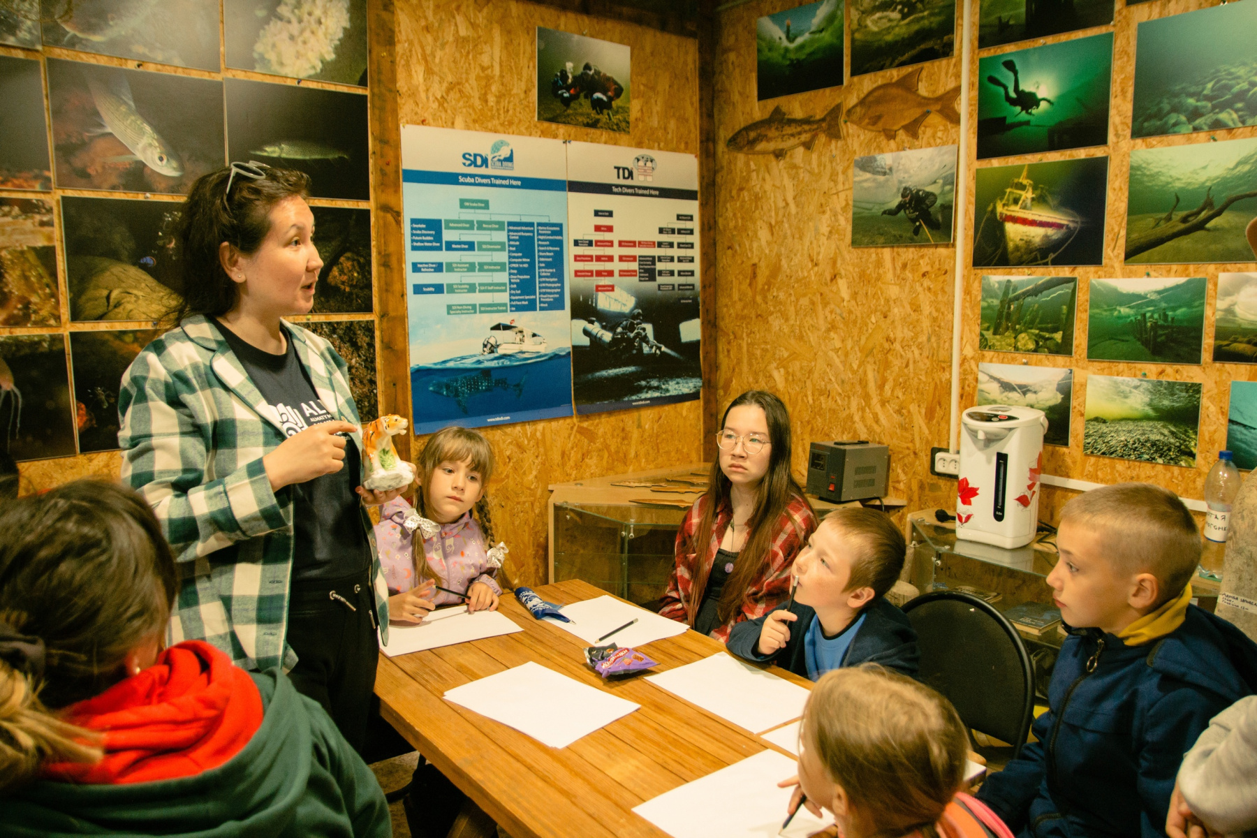 Вечером участники собрались в дайв-центре заповедника, для того чтобы провести творческий мастер-класс "Сохраним наш Мир!" для школьников и дошкольников Яйлю. Под руководством Амины Сурпкеловой и помощи Павла Модорова (автора анимационного фильма про Республику Алтай) ребята из Яйлю создали свои рисунки с туранским тигром. По ходу мастер-класса участники вели просветительские беседы с маленькими жителями Яйлю. Очень приятно, что у них есть понимание важности сохранения исчезающих видов.