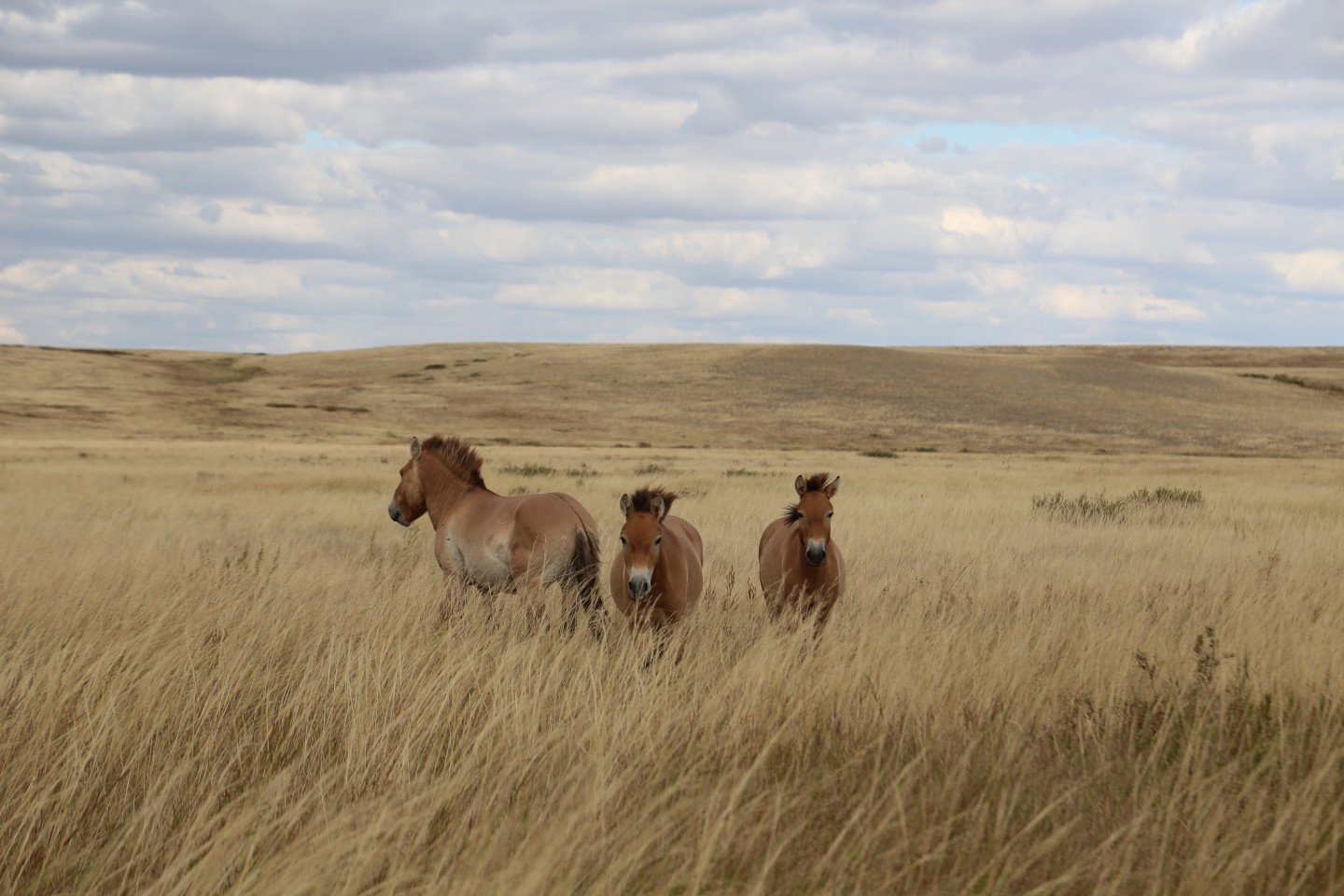 Вместе с Евгением Булгаковым, руководителем Центра реинтродукции лошади Пржевальского, мы, наконец, смогли приблизиться к новому вожаку. Суба держал уверенную дистанцию, позволив угостить себя и кобыл овсом и сделать несколько снимков. Не доел и спешно скрылся за линией горизонта. Кобылы, колеблясь, тоже покинули оставшиеся горстки овса.
